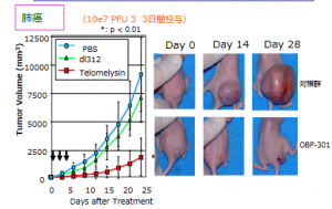 大腸がんを移植し、リンパ節転移を引き起こしたマウスにテロメライシンを投与したところ、7日後に消失したとのこと。