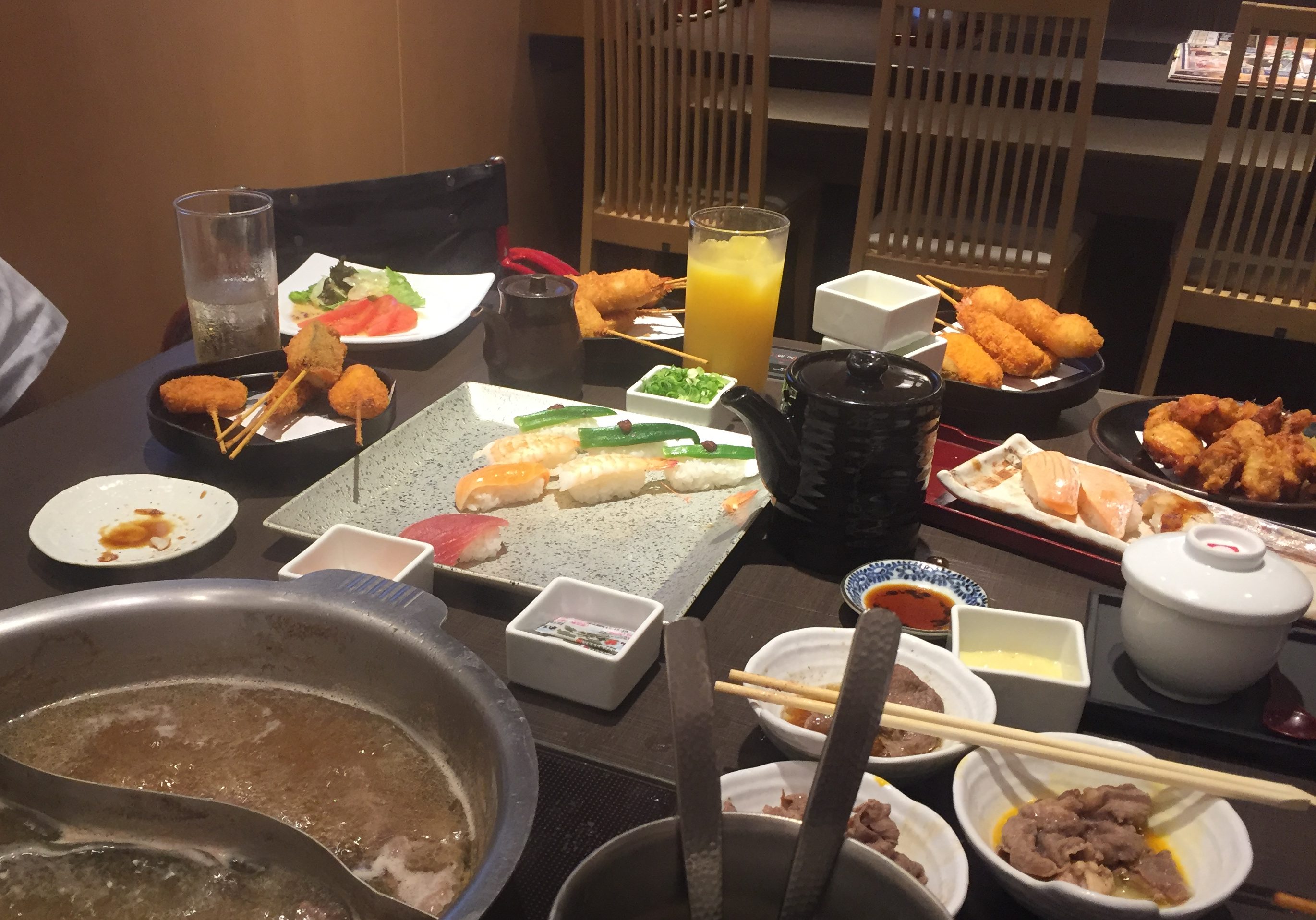 豚だけ食べるのは寂しいと思いながらも、貧乏なワタクシたちは躊躇いもなく「牛しゃぶしゃぶ・寿司・串揚げコース(写真のやつね)」を頼む。