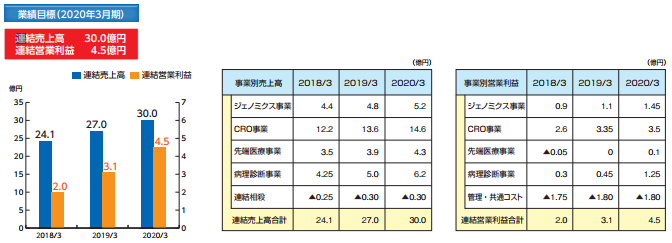 会社が成長事業と位置付けている、遺伝子解析受託を行う先端医療事業と、バイオマーカー解析などを行う病理診断事業は不調で、中期経営計画も見直してきましたが、数字的にはかなり保守的に見てきた印象です。