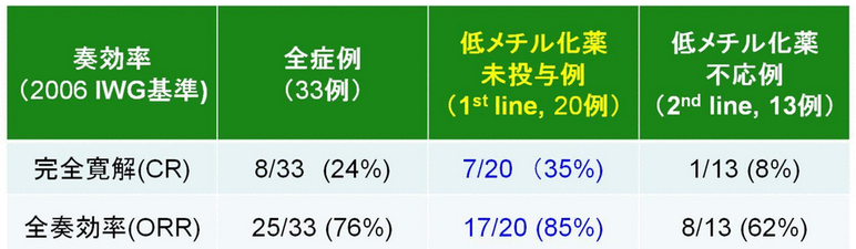 上記は欧米のフェイズ1・2(33症例)のリゴセルチブとアザシチジンの併用結果です。