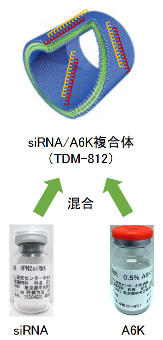 下のようなナノチューブ構造の「A6K」に「siRNA」が付着した複合体(TDM-812)にすることで、生体内でsiRNAが分解されにくくなるとともに、がん細胞へのsiRNAの取り込みが促進されます。