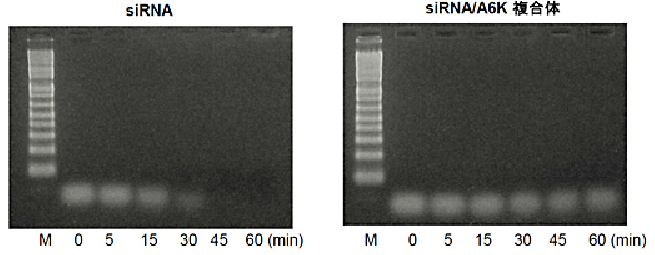 siRNA単独だと一時間も持たずに分解されていますが、A6Kとの複合体(TDM-812)だと、消えずに安定化していることが分かります。
