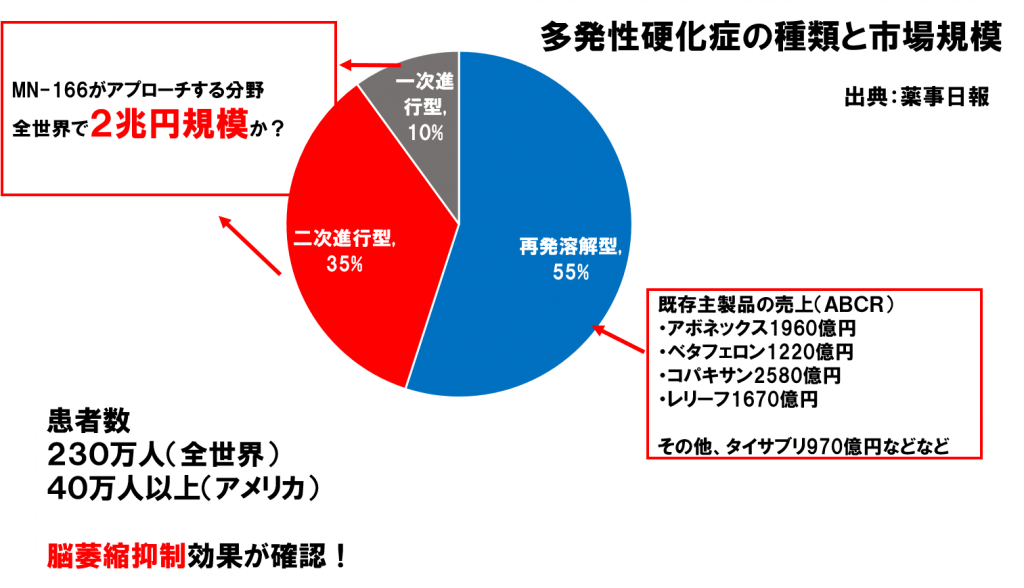 メディシノバさんはMN-166の作用機序からいって「多発性硬化症(進行型を含む)にも効果があるのでは?」と考え、杏林製薬から権利を買って、多発性硬化症を対象としたお薬としても認めてもらえるように開発を進めていたのです。
