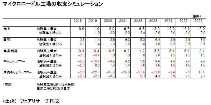 もう一回見てみると、このレポートでは工場建設費用を治験用を4~5億、量産用を35億として試算しています。