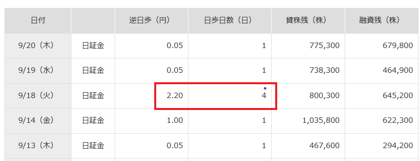 火曜日に空売りをして、翌日の水曜日に買い戻して決裁をしたとしても、その受け渡しは土日を挟んだ翌週になるので、それまではずっと逆日歩が掛かるよってことですね(この年、9月24日(月)は祝日だったので、火曜日から3営業日後の「金・土・日・月」と日歩日数は4日間)。