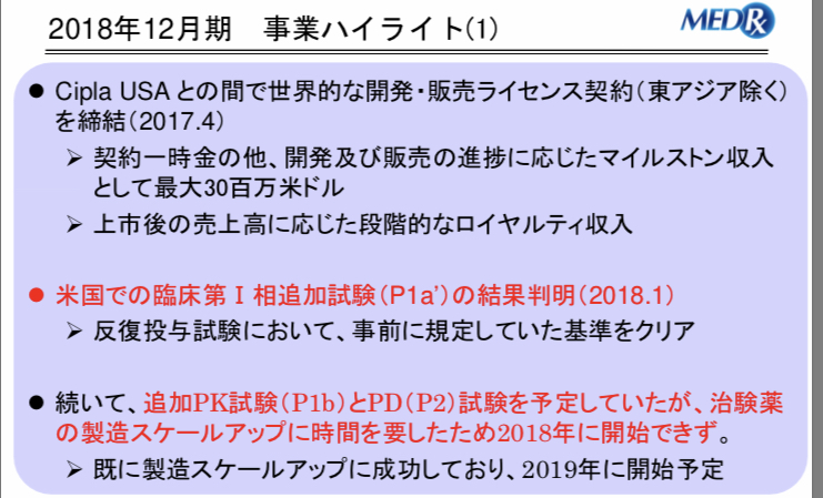 去年の期ズレの原因となった製造スケールアップには成功し、2019年にフェイズ1b/2を開始予定。
