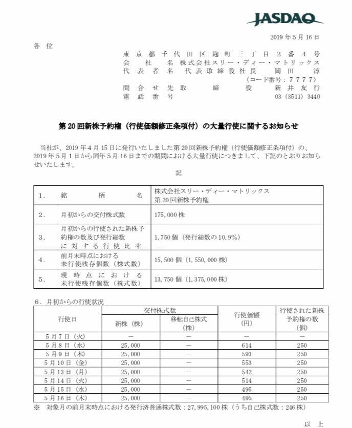 出典:3Dマトリックス 第20回新株予約権の大量行使のお知らせ