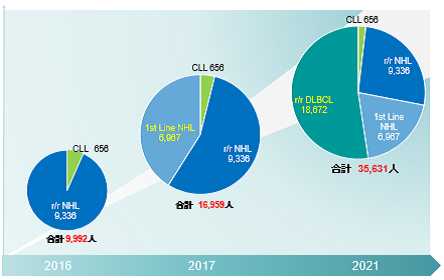 一方、現在の主要パイプラインである白血病治療薬のトレアキシンの場合、来年のDLBCLへの適応拡大を前提とすると、患者数は36,000人います。