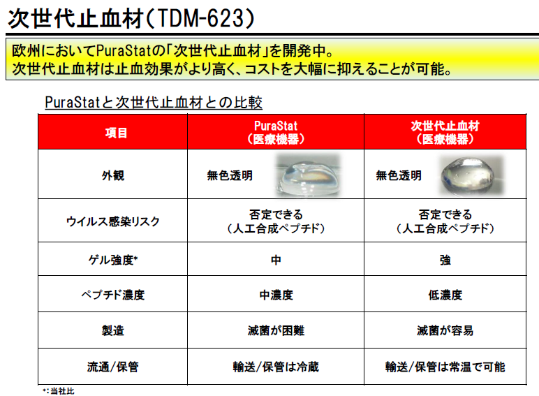 ゲル強度と止血力が既存のpurastatよりも強く、かつ常温保存・常温物流が可能なため、原価も低減できるというメリットがあります。