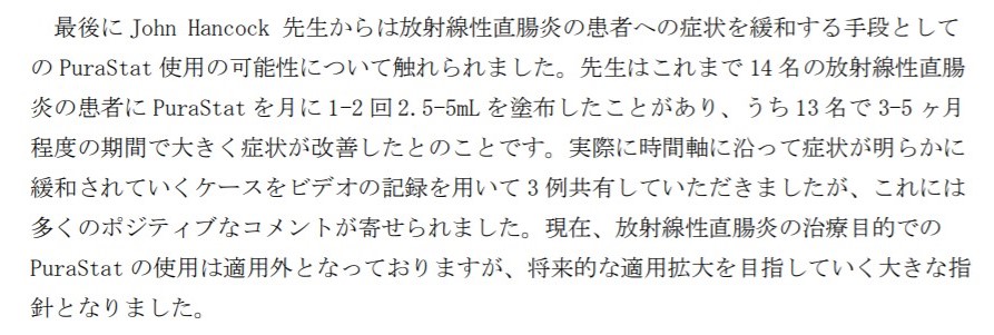 特に放射線性直腸炎の治療目的で使用され、「月に 1-2 回 2.5-5mL を塗布したことがあり、うち 13 名で 3-5 ヶ月程度の期間で大きく症状が改善」ってのがすごいよなあ。
